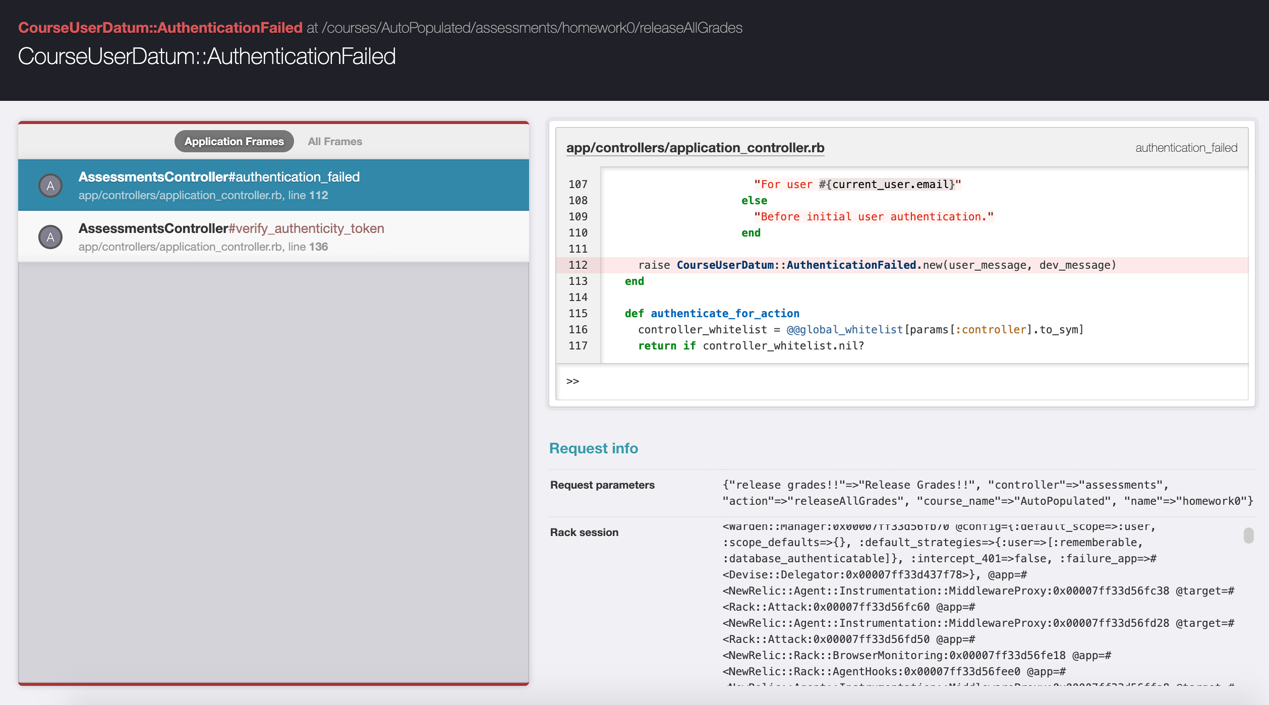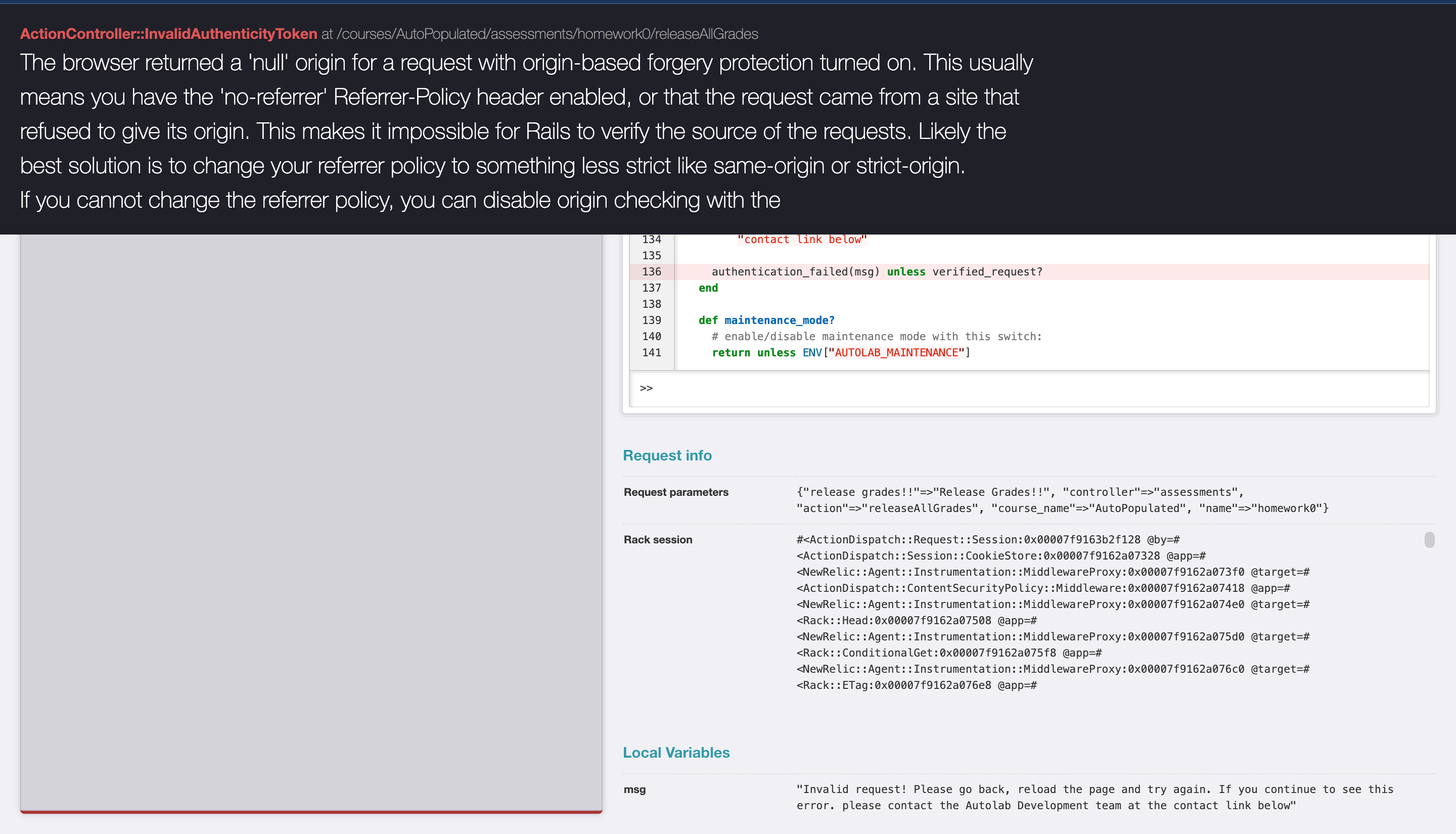 I can confirm that CSRF doesn't seem to be working as intended. I first tried using postman to send a POST request, which actually failed (didn't release grades), but by making just an html file with a form and using that to send a POST request, I was able to release all grades without being on autolab. This definitely seems to be a bit more tricky than originally thought. |