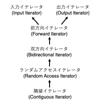 C++標準ライブラリのイテレータは、以下のように階層的に定義される。 この階層はC++言語機能の継承と同じように見なせる。たとえば、入力イテレータと前方向イテレータはis a関係が成り立っており、前方向イテレータは入力イテレータと見なすことができる。