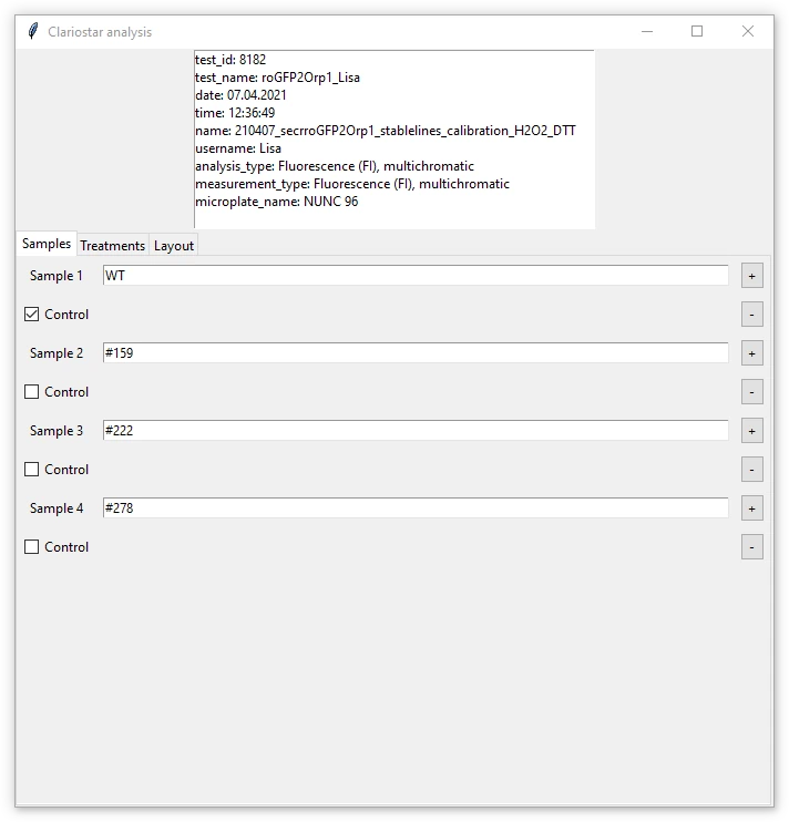 This application aims to make it easier to analyze the data generated by the CLARIOstar® Plus microplate reader by enabling users to easily configure different treatments and repetitions of samples analyzed by the microplate reader. Currently it supports working with the data generated when using Thermo Scientific™ Nunc™ 96-DeepWell™ Polystyrene Plates and the following Analysis settings: