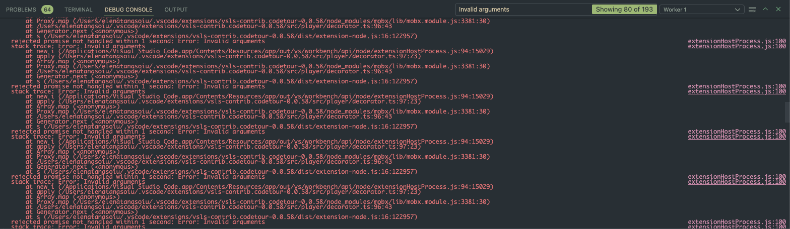 Unfortunately this doesn't fix all of the occurrences of "Unhandled arguments" and I don't have a stack trace to work with in the codespace when these errors are thrown. So I'm thinking of disabling this functionality of catching unhandled rejections for the codespace as it's preventing us from running the code tour successfully at the moment. |